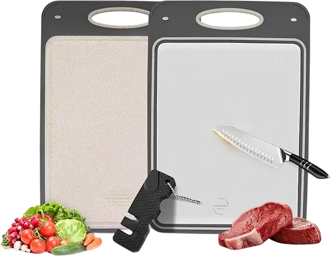 The only cutting board you’ll ever need – sleek stainless steel for meats & pastry, eco-friendly wheat straw for fruits & veggies.